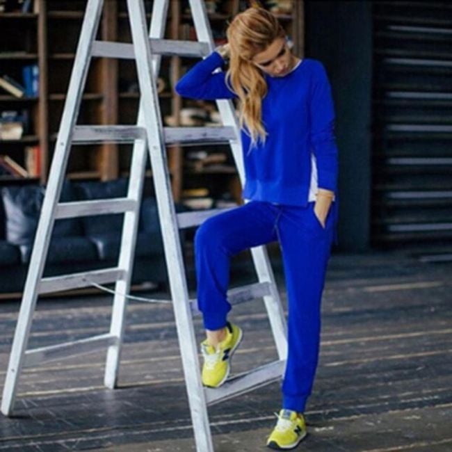 La tuta casual è composta da pantaloni con vita elastica e una felpa dal taglio più ampio con spacchi sui lati.