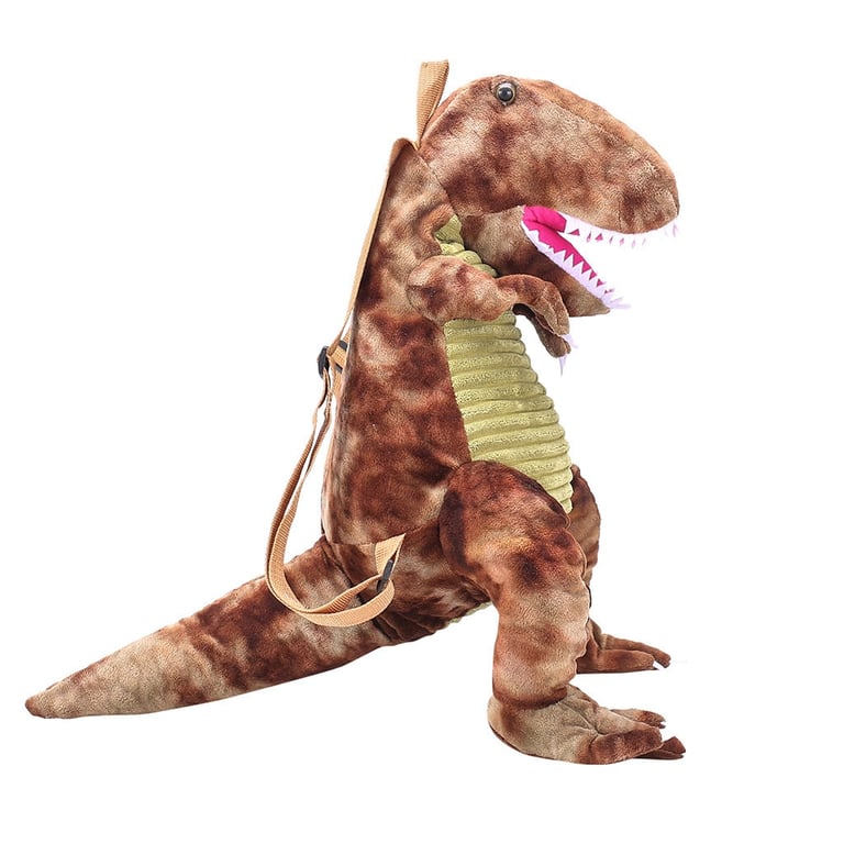 Il dinosauro è realizzato in un morbido materiale di peluche e ha spallacci regolabili.