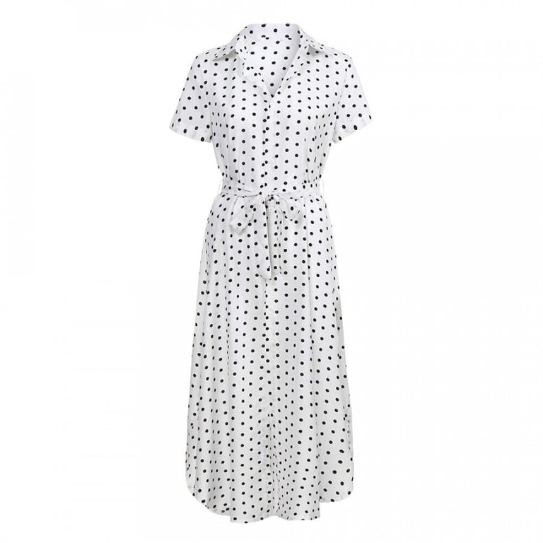 Abito lungo da donna avvolgente con motivo a pois. Maniche corte e scollatura a V. Cintura da legare in vita. Due varianti di colore.