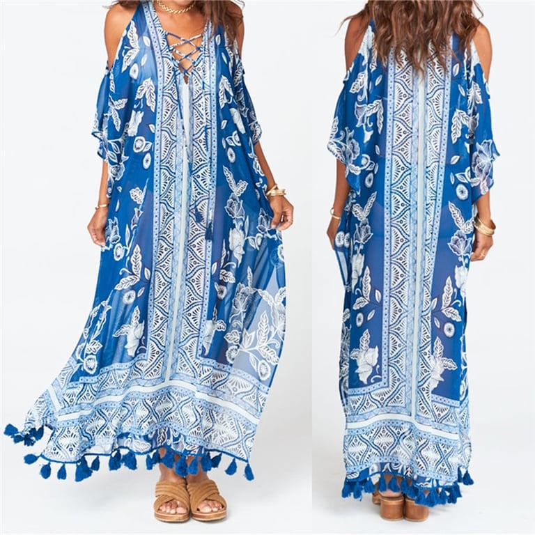 Con questo bellissimo abito blu con motivo boho in spiaggia sicuramente farete colpo!