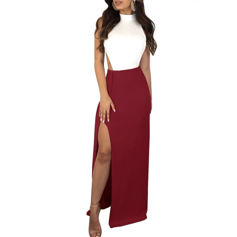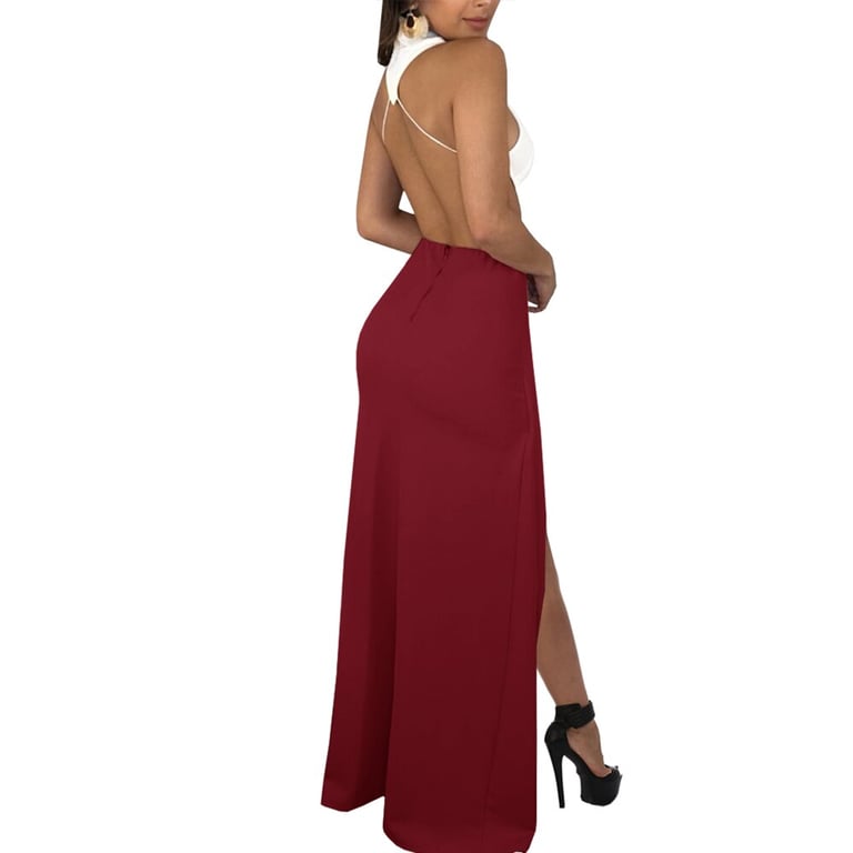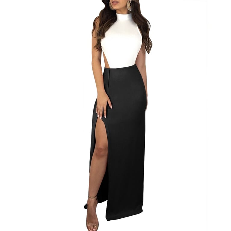Lungo fino a terra, senza maniche, con scollo, con schiena scoperta, chiusura con zip sul retro, con spacco alto, con fianchi scoperti.