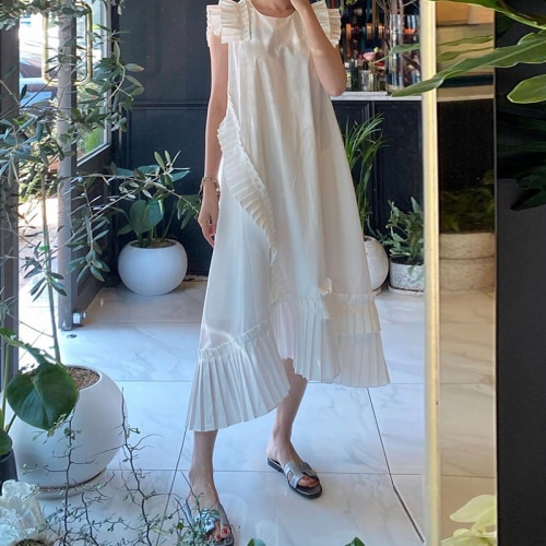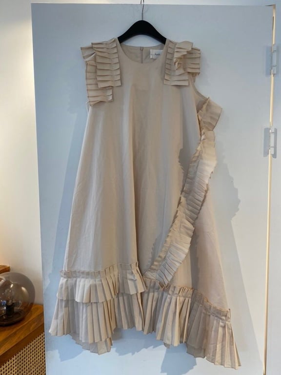 Questi vestitini sono disponibili in tre colori neutri. Sono molto lunghi, con maniche corte e decorati con numerosi volant.