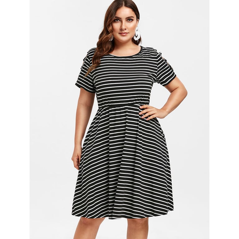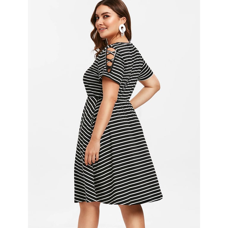 Abito da sera da donna con motivo a righe. L'abito ha maniche corte, scollatura rotonda e gonna a forma di A. Taglie plus size.