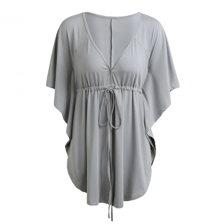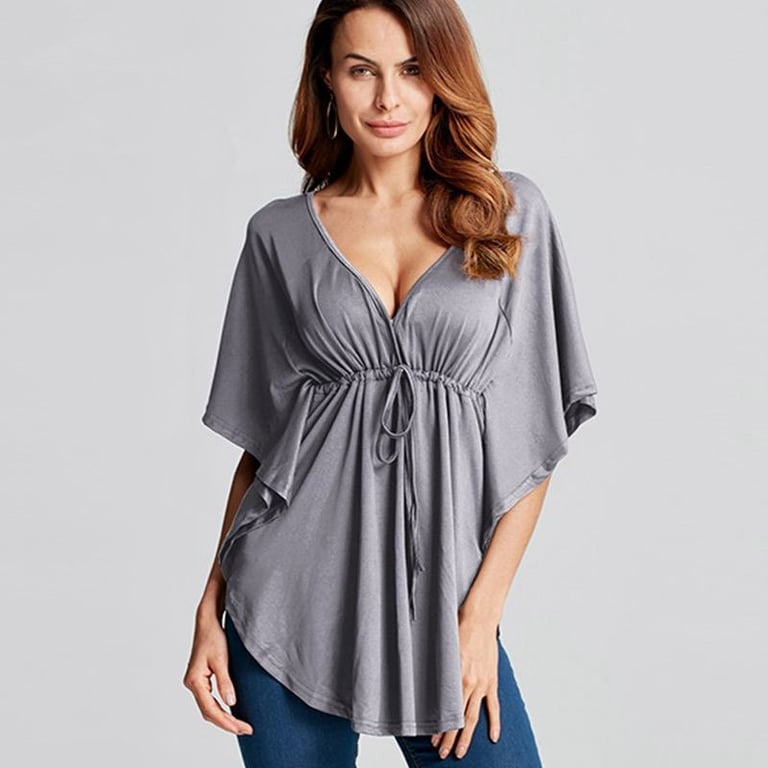 Top da donna con maniche a pipistrello e profondo scollo a V. Taglio asimmetrico e morbido con cordoncino per stringere sotto il seno. Taglie plus size. Disponibile in diverse varianti di colore.
