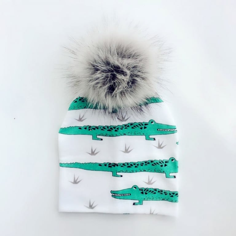 Berretto in cotone invernale con motivo colorato. Il berretto ha un grande pompon peloso che può essere staccato. Disponibile in diverse varianti.