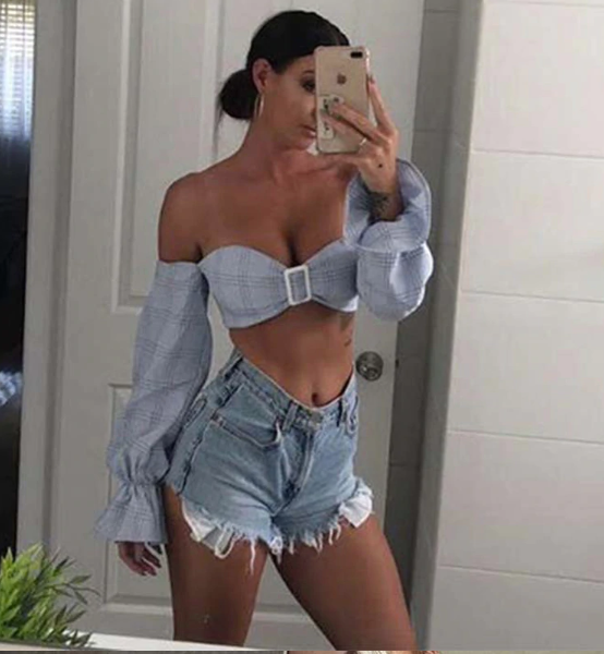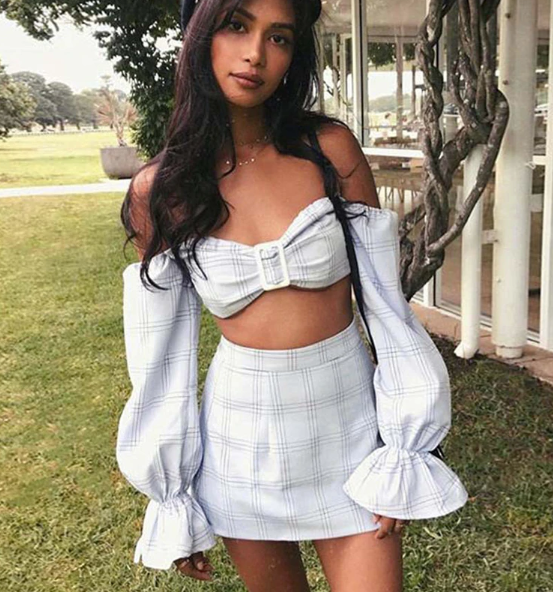 Completo da donna a due pezzi a quadri per il tempo libero.