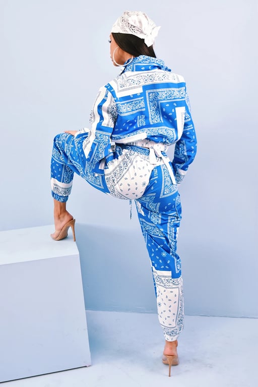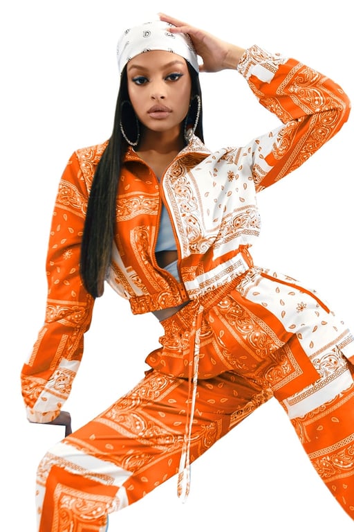 Il set è composto da pantaloni con tasche e una felpa crop top con zip.