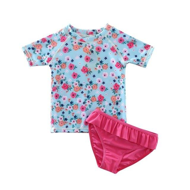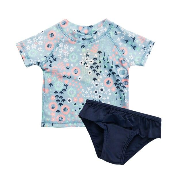 Costumi da bagno per ragazze con maglietta. La maglietta ha sopra delle piccole immagini. Disponibile in più varianti. I costumi sono realizzati in spandex.