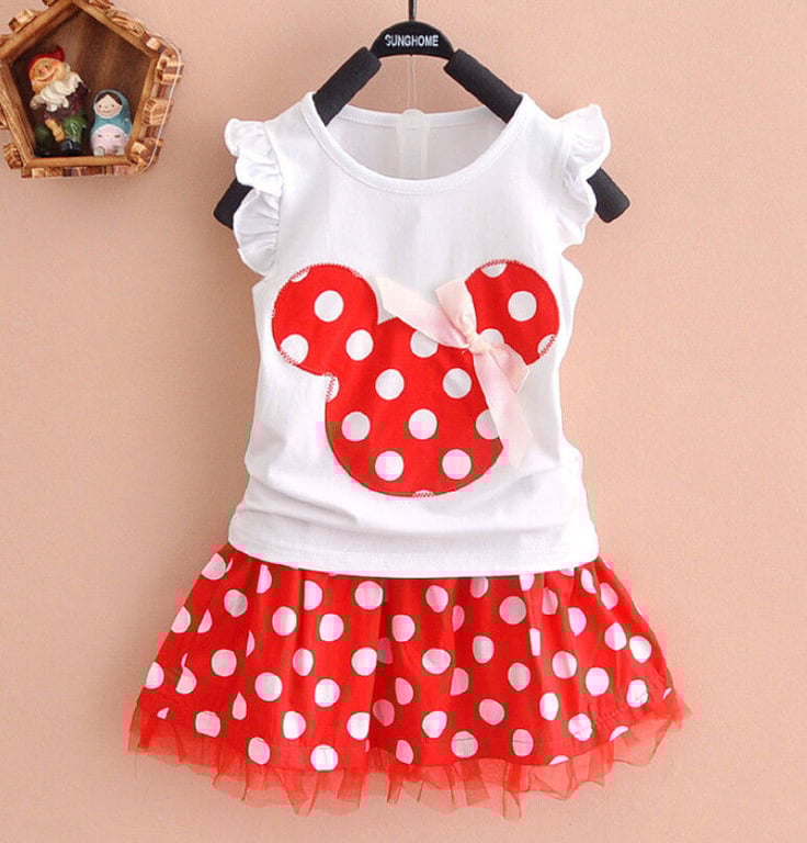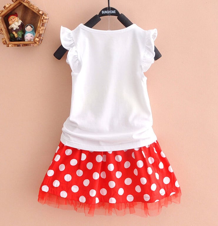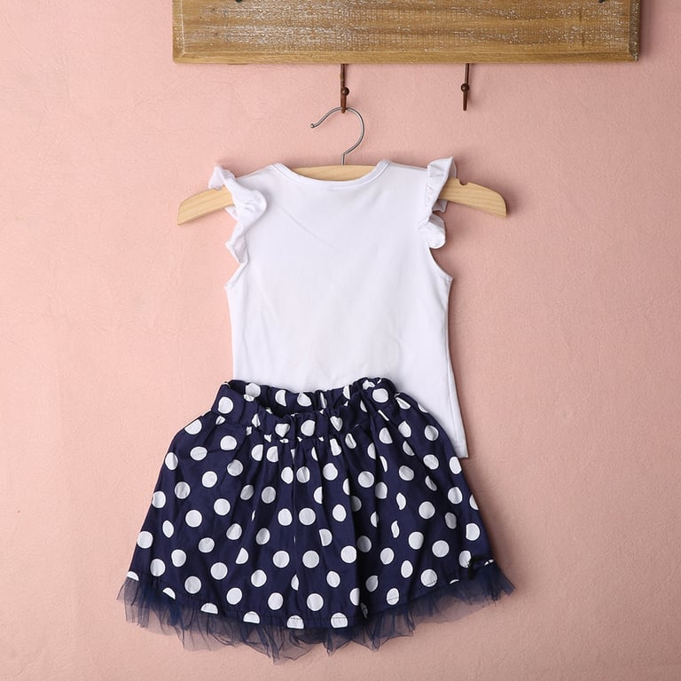 Delizioso set estivo a pois per ragazze – canotta con volant e gonna decorata con fiocco e stampa