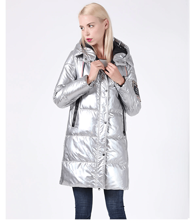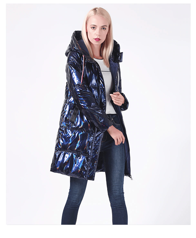 Giacca lunga da donna moderna e lucida.