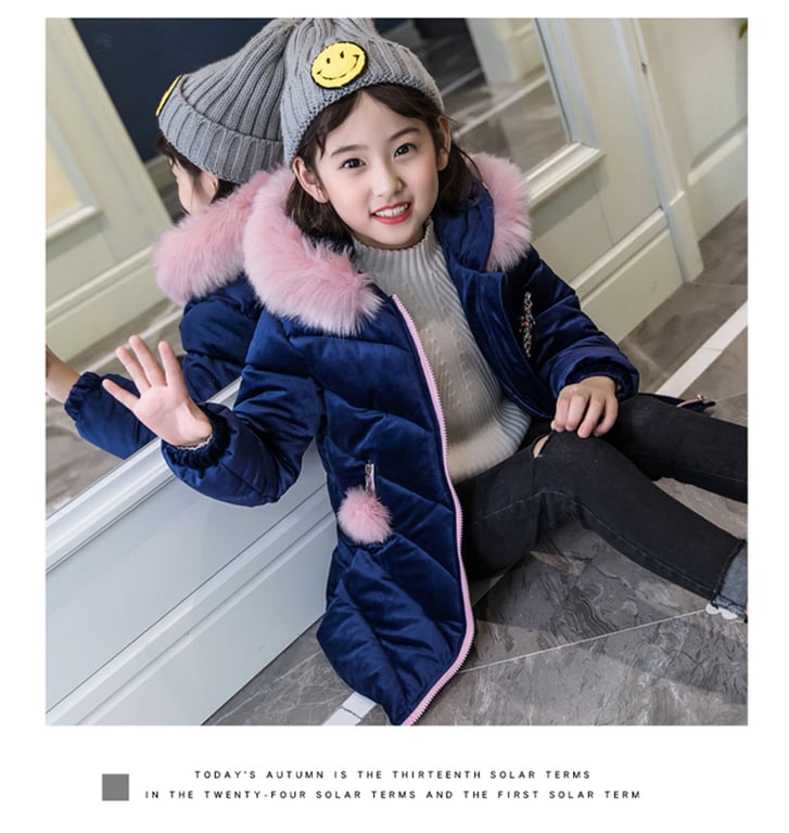 Super giacca in piuma per ragazze. Bellissimo colore blu.