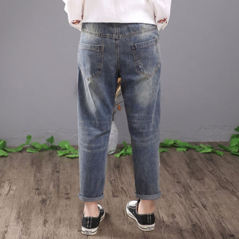 Jeans da donna in stile boyfriend con vita elastica in gomma. Pantaloni larghi. Aspetto usurato. Decorati con toppe.