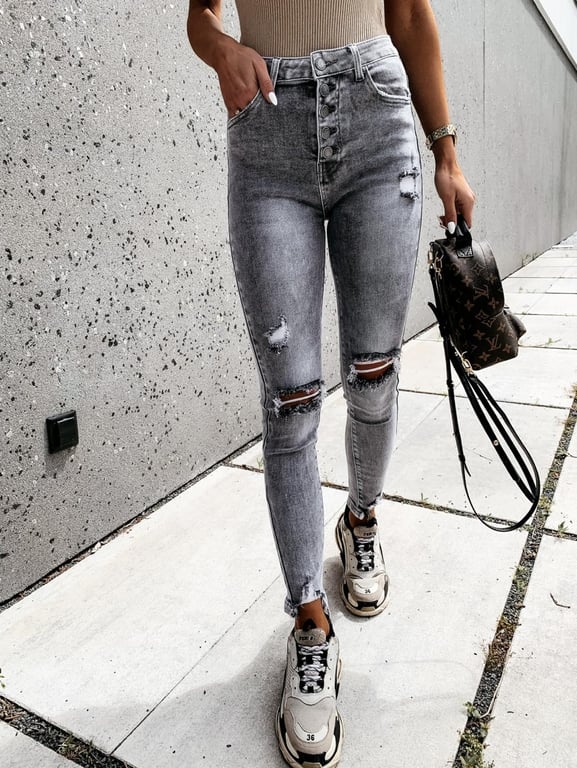 Jeans da donna grigi aderenti strappati con bottoni e vita alta