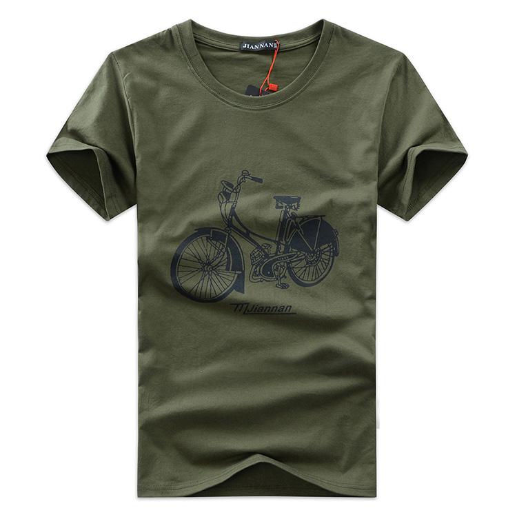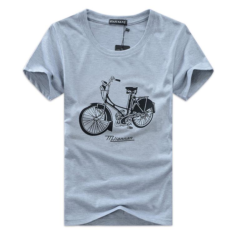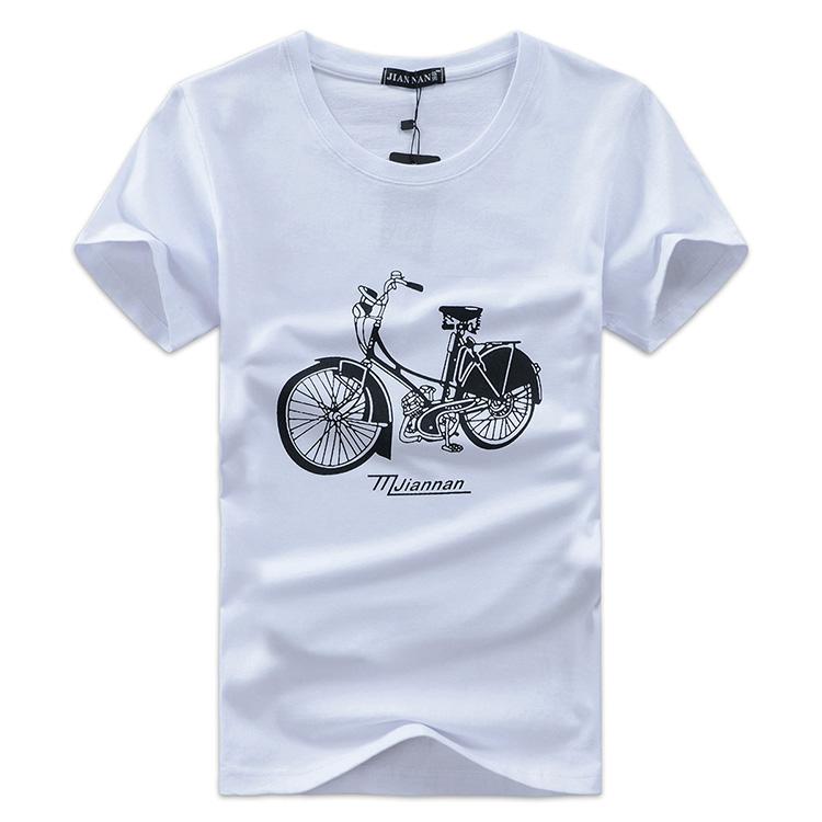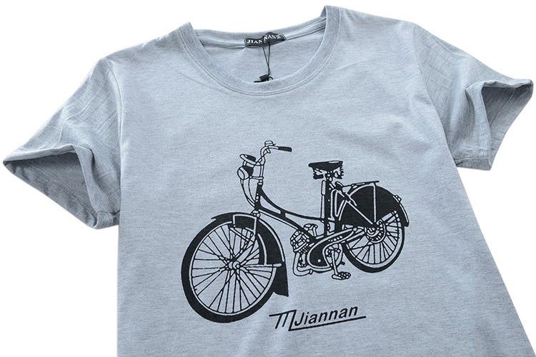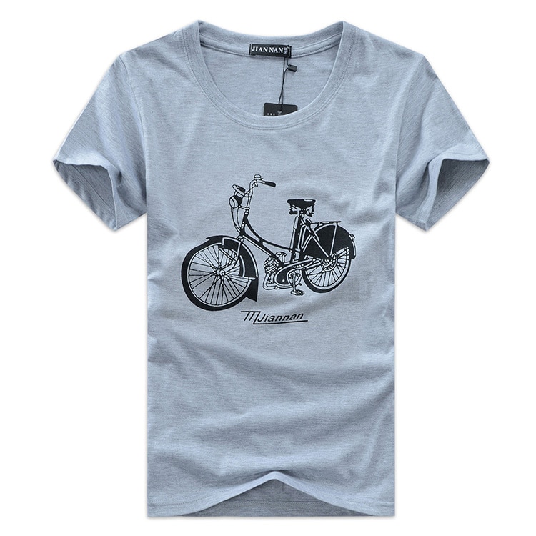 T-shirt stilosa da uomo, adatta per l'uso quotidiano. Disponibile in diverse colorazioni e decorata con una stampa di una bicicletta. La maglietta ha maniche corte e scollatura ovale.