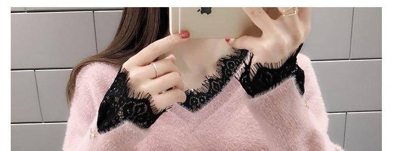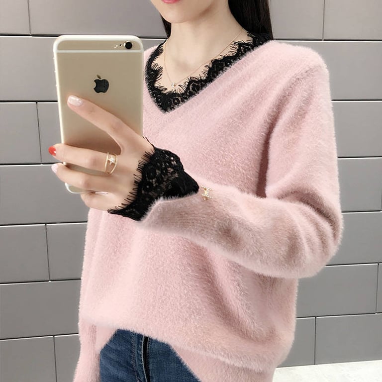 Acquista questo adorabile maglione. È rosa, caldo e decorato con pizzo nero sulle maniche e sul collo.
