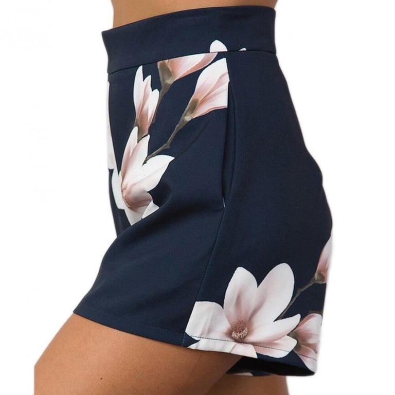 Shorts da donna con vita alta e chiusura con zip sul retro. Taglio ampio. Stampa colorata con motivo floreale.