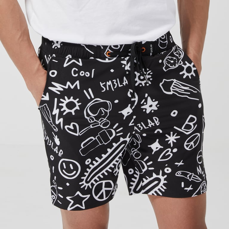 • Vita con elastico comodo, con cordoncino regolabile, con tasche e stampa originale.