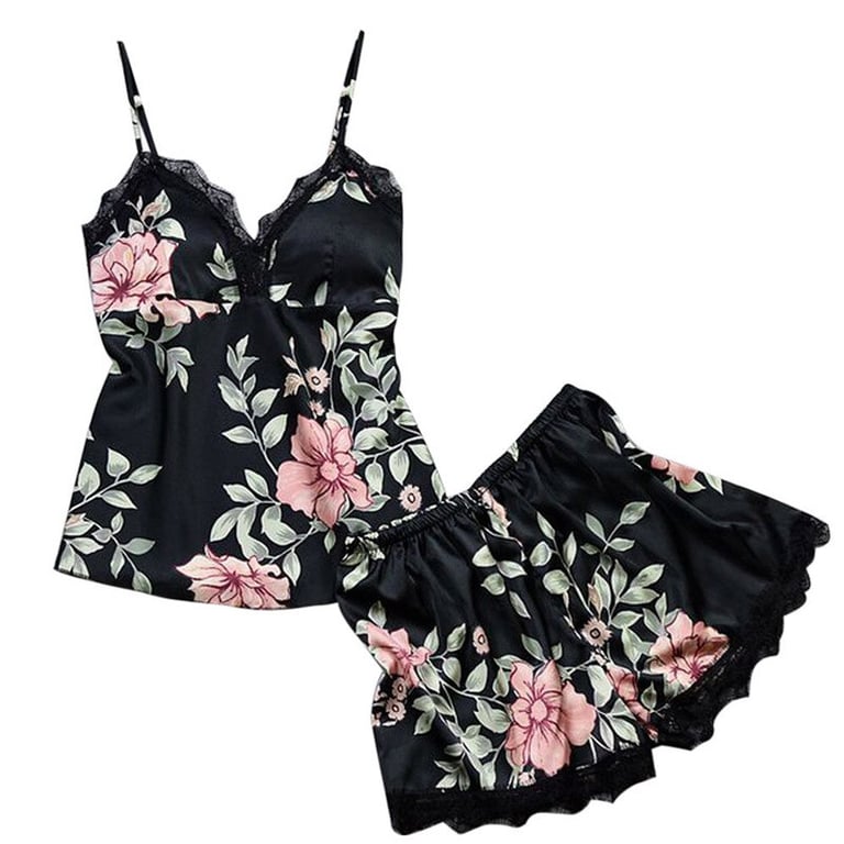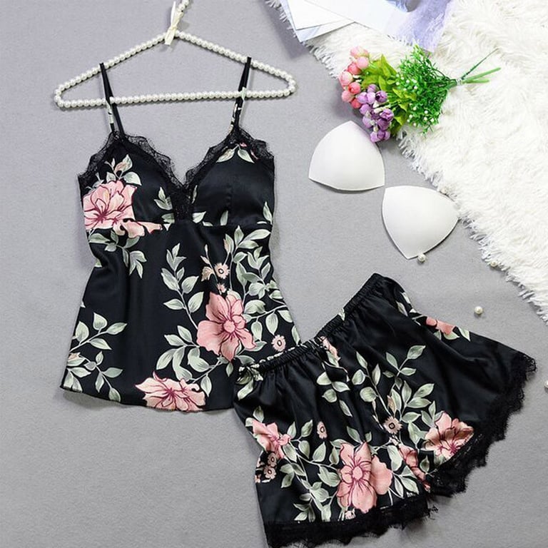 Set di pigiama da donna in satin con pizzo. Stampa colorata con motivo floreale. Il set include una camicia a spalline sottili e pantaloni corti con vita elastica. Disponibile in diverse varianti di colore.
