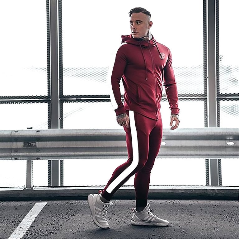 La felpa ha maniche lunghe, cappuccio, tasche e chiusura con zip. Le maniche sono decorate con strisce bianche. I pantaloni sono molto comodi e sono anche decorati con strisce sui lati.