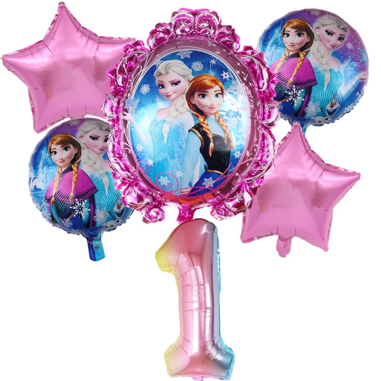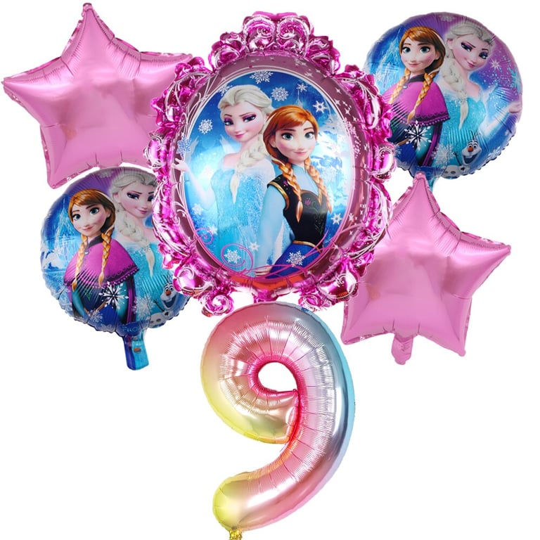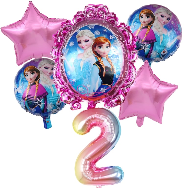 Nel set troverai 1 pezzo di numero, 1 pezzo di grande palloncino con Elsa, 2 pezzi di palloncini a forma di stella, 2 pezzi di palloncini più piccoli
