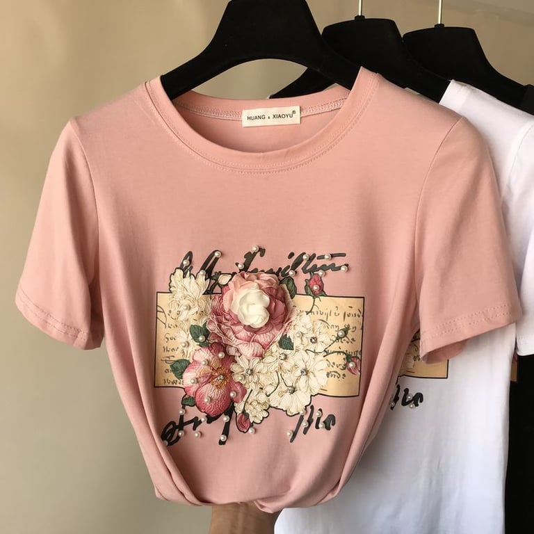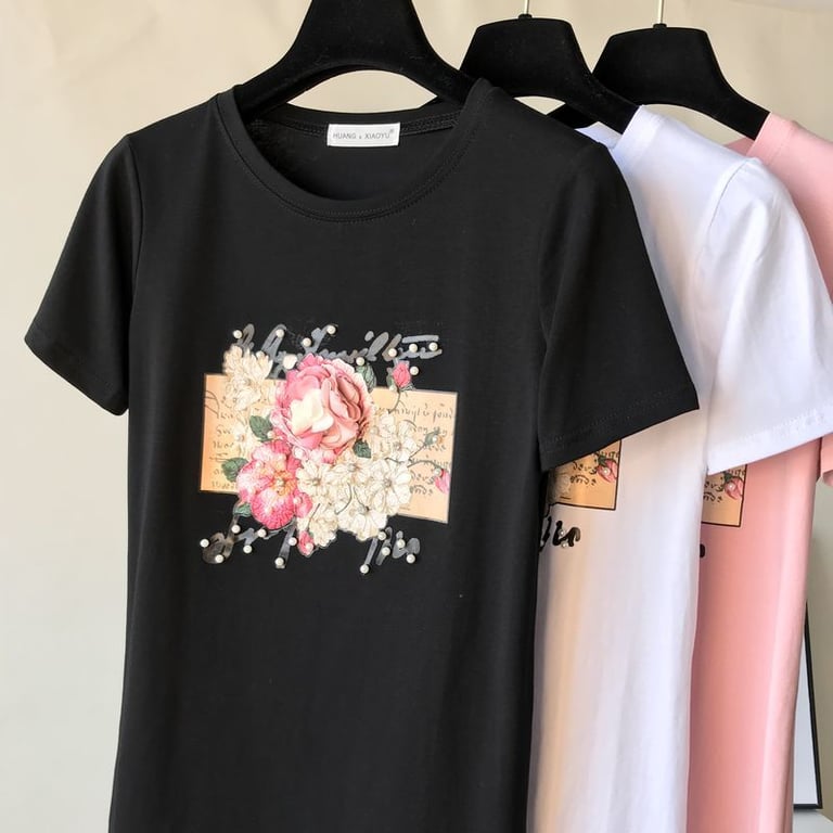 T-shirt da donna con bellissimo ricamo floreale e perline.