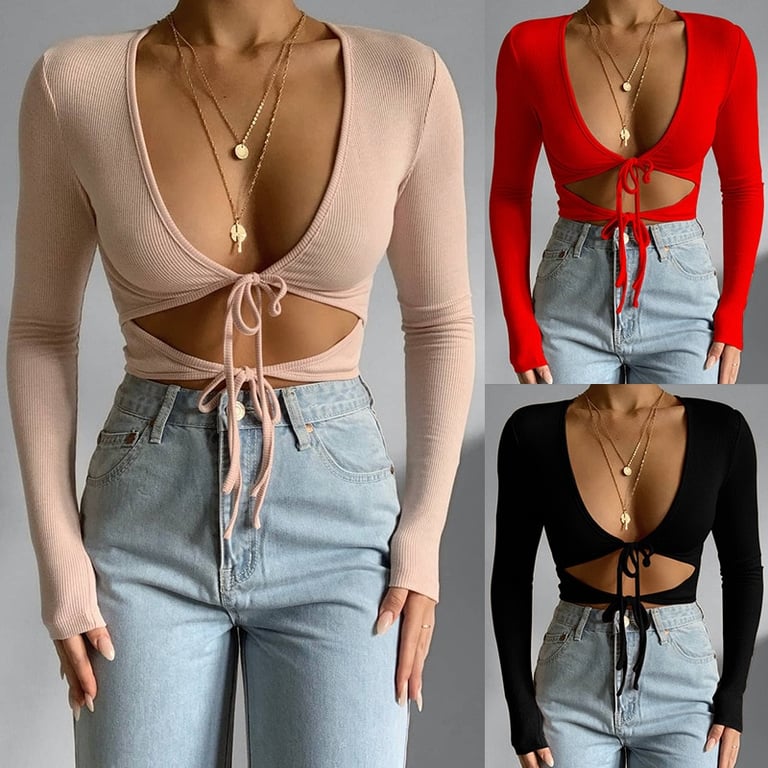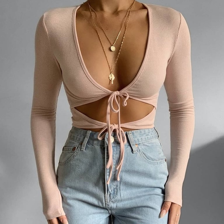 • – Il top ha maniche lunghe e un décolleté sexy